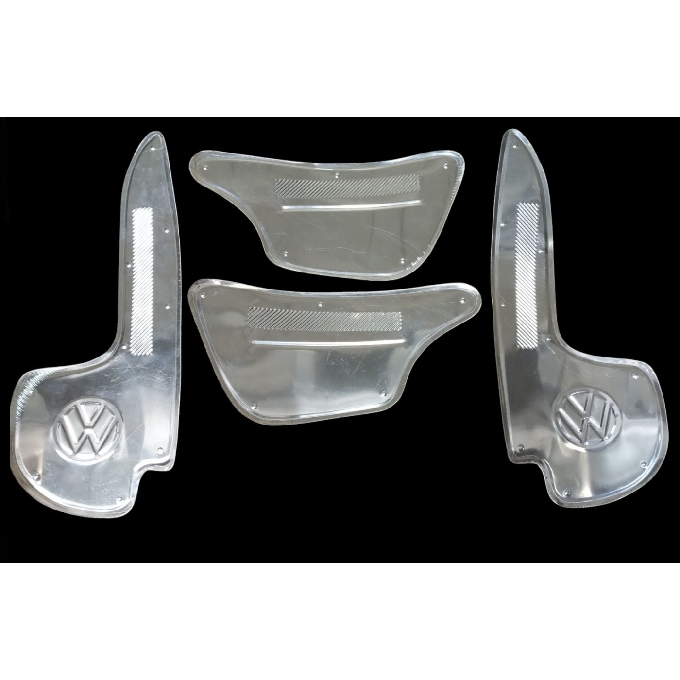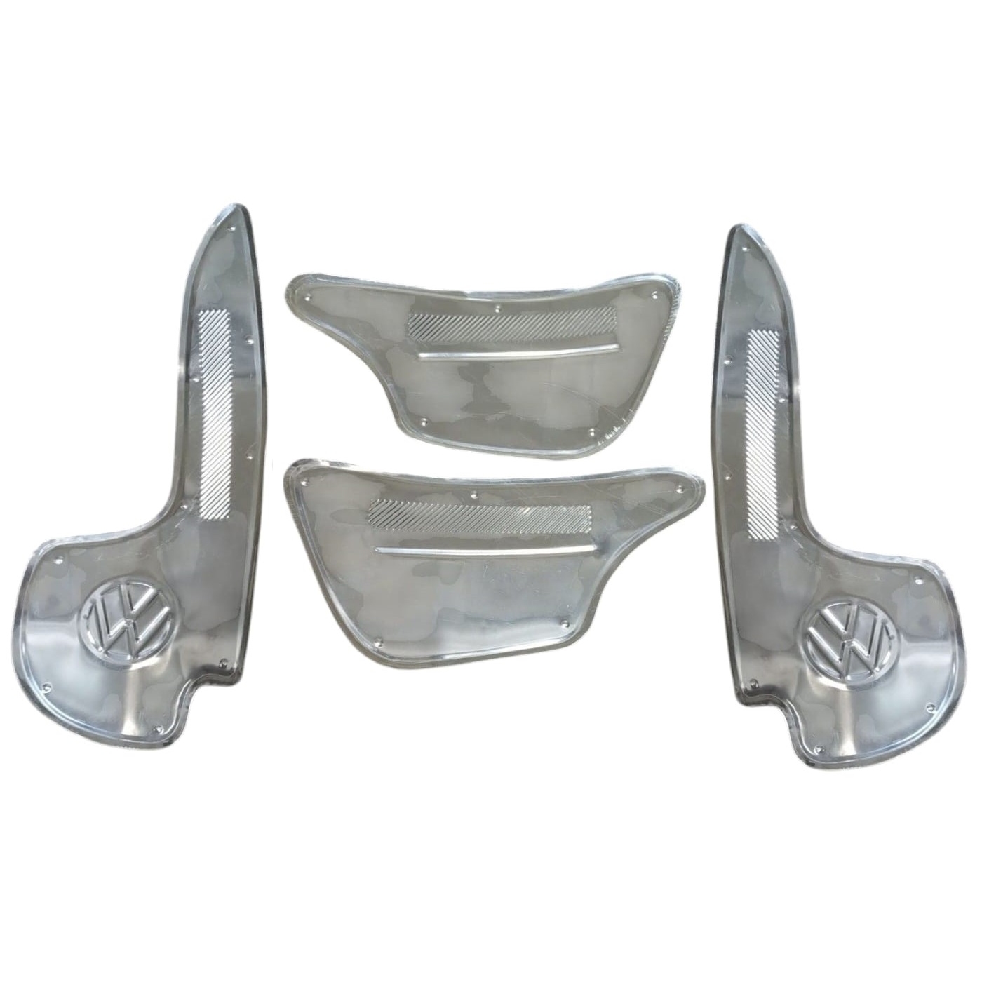 Kit polaina modelo americana em inox. O kit contém 4 peças (2 polainas dianteiras e 2 polainas traseiras dos para-lamas). As traseiras vem com o logo VW estampado. Podem ser usadas em todos os anos do Fusca.