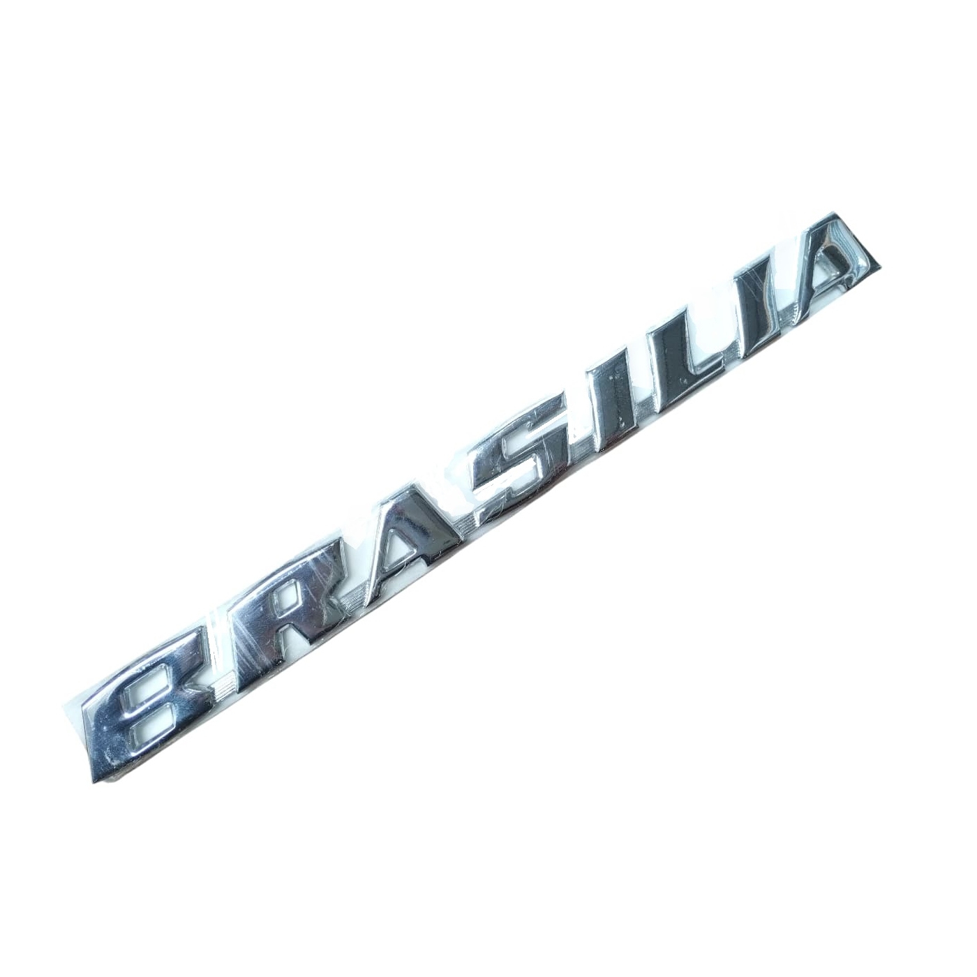 Emblema em metal cromado para a traseira do VW Brasília. Peça fixada por parafusos